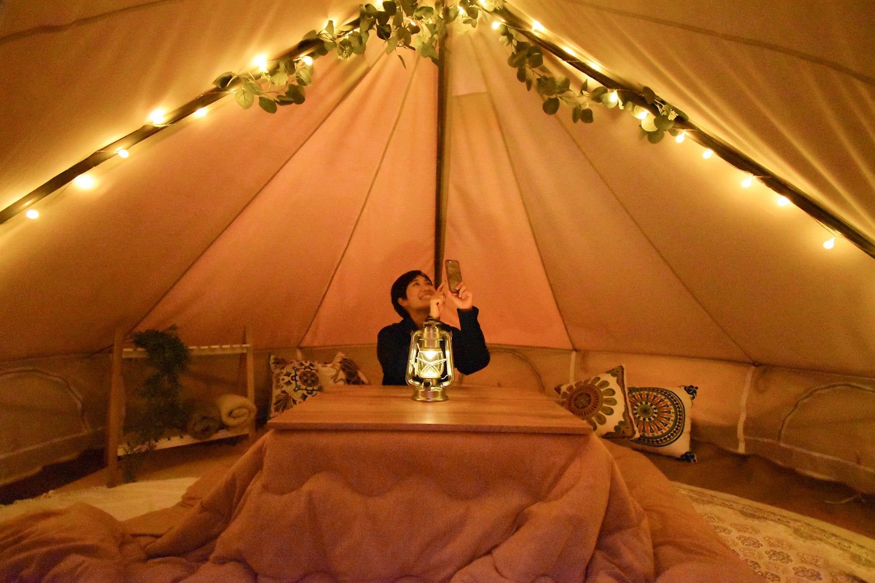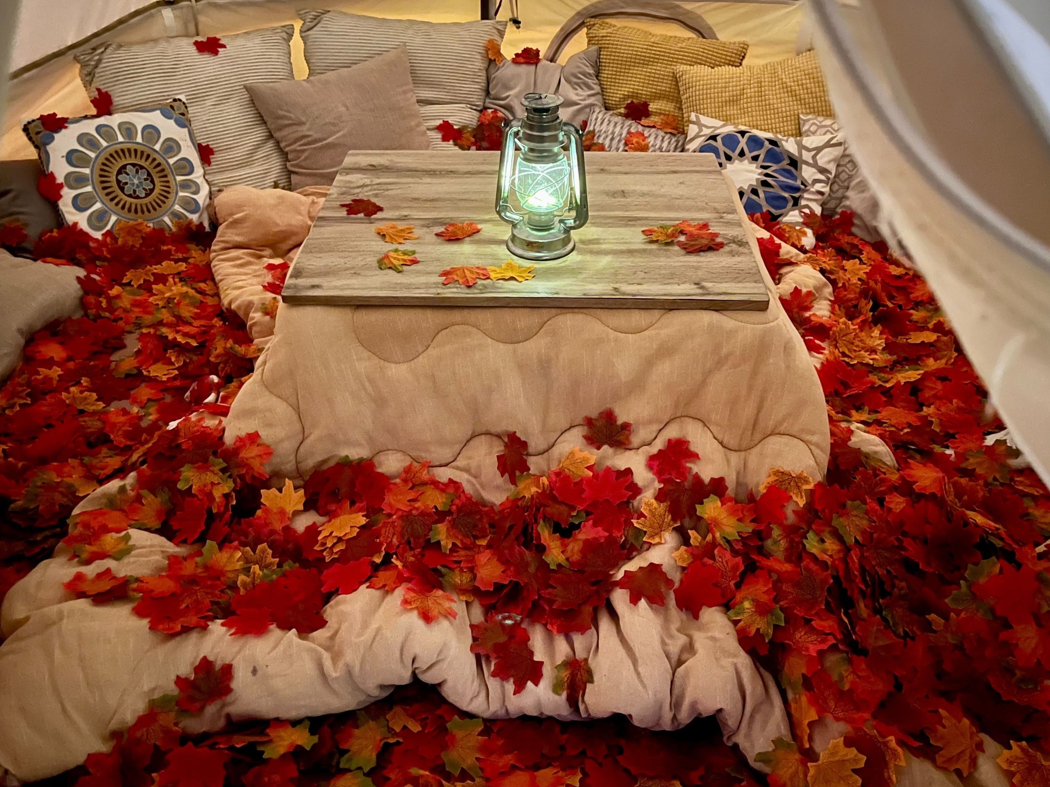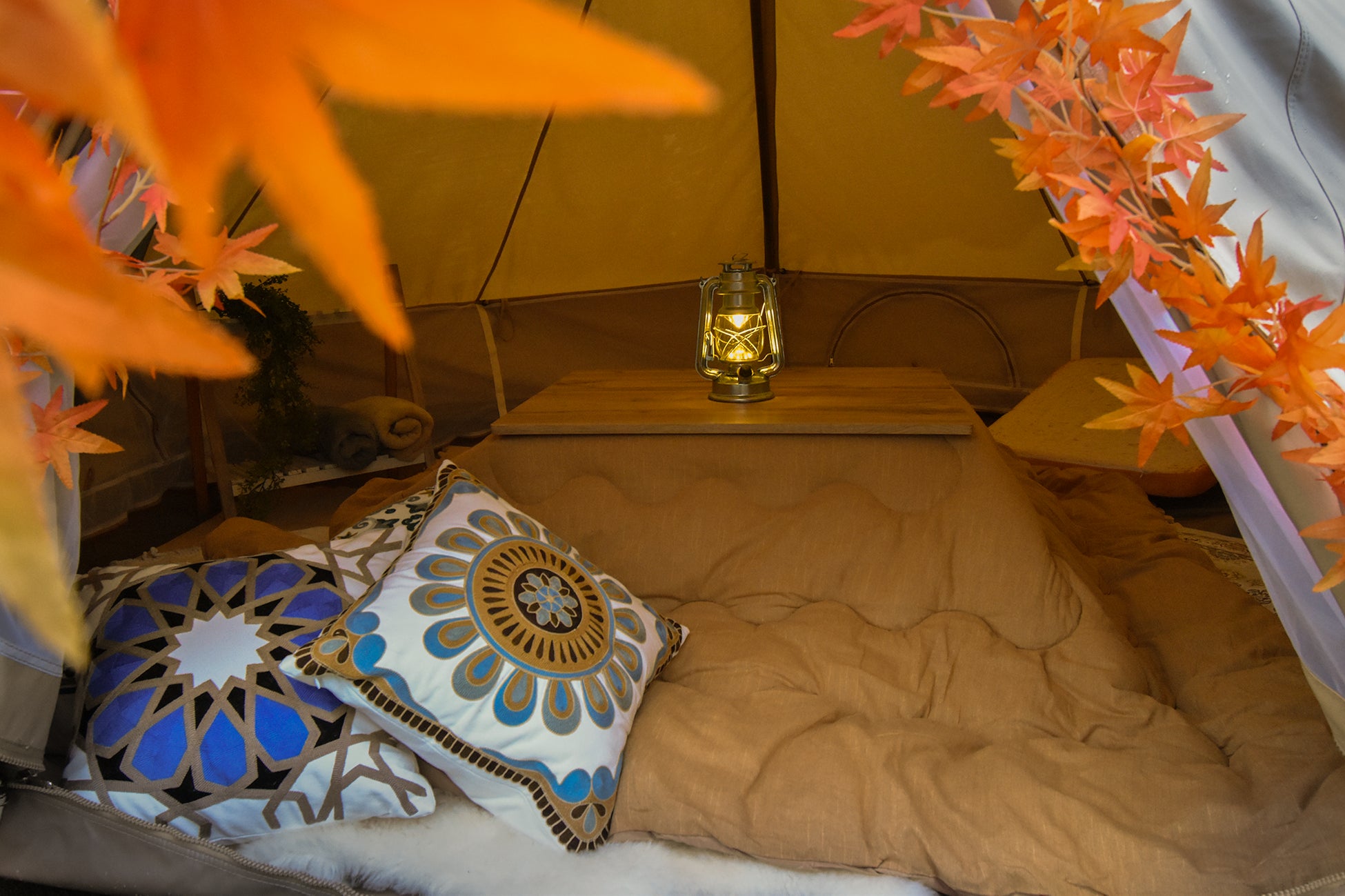 テント内には、これから冷え込む時期に嬉しいこたつをご用意。ランタンの優しい光、ふかふかのクッションやブランケットに包まれながら、時間を忘れてゆったりとお寛ぎいただけます。秋でも冷え込む京都の観光で歩き疲れて冷え込んだ体を癒す”ぬくぬく空間"で、ご家族やご友人と共に「ほっ」と一息つける癒しの時間をお楽しみください。