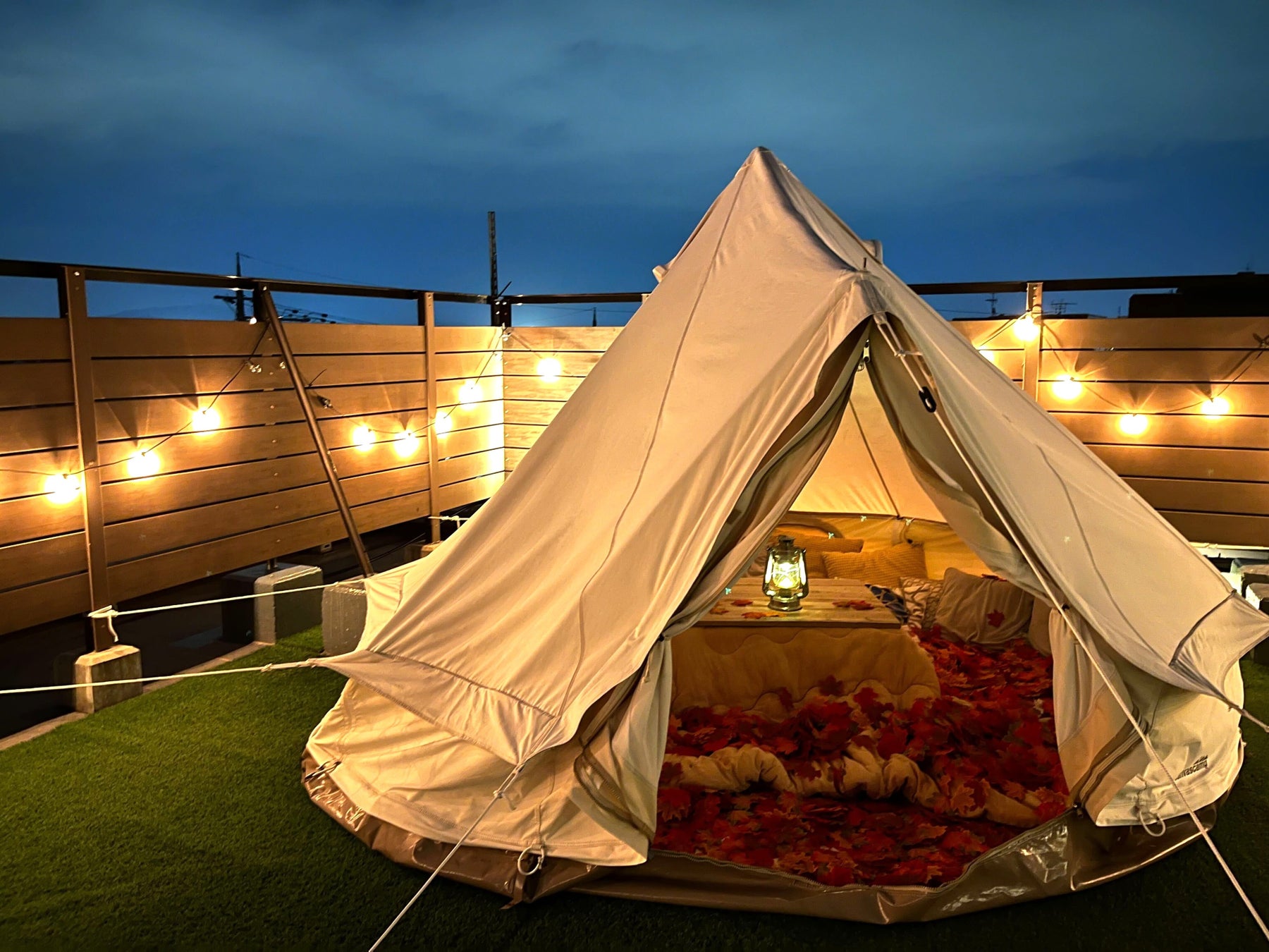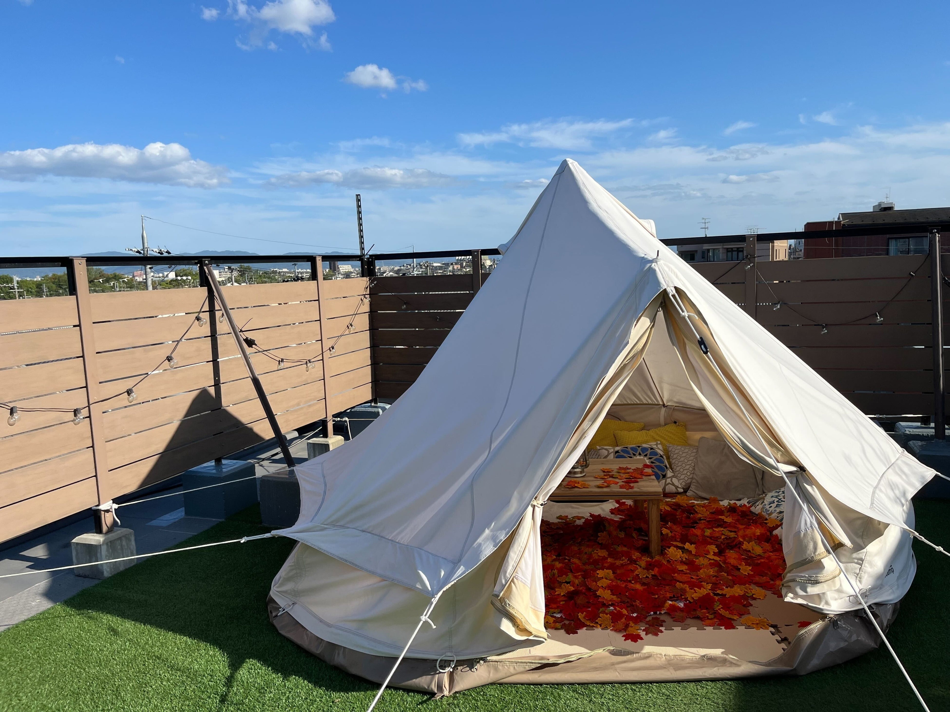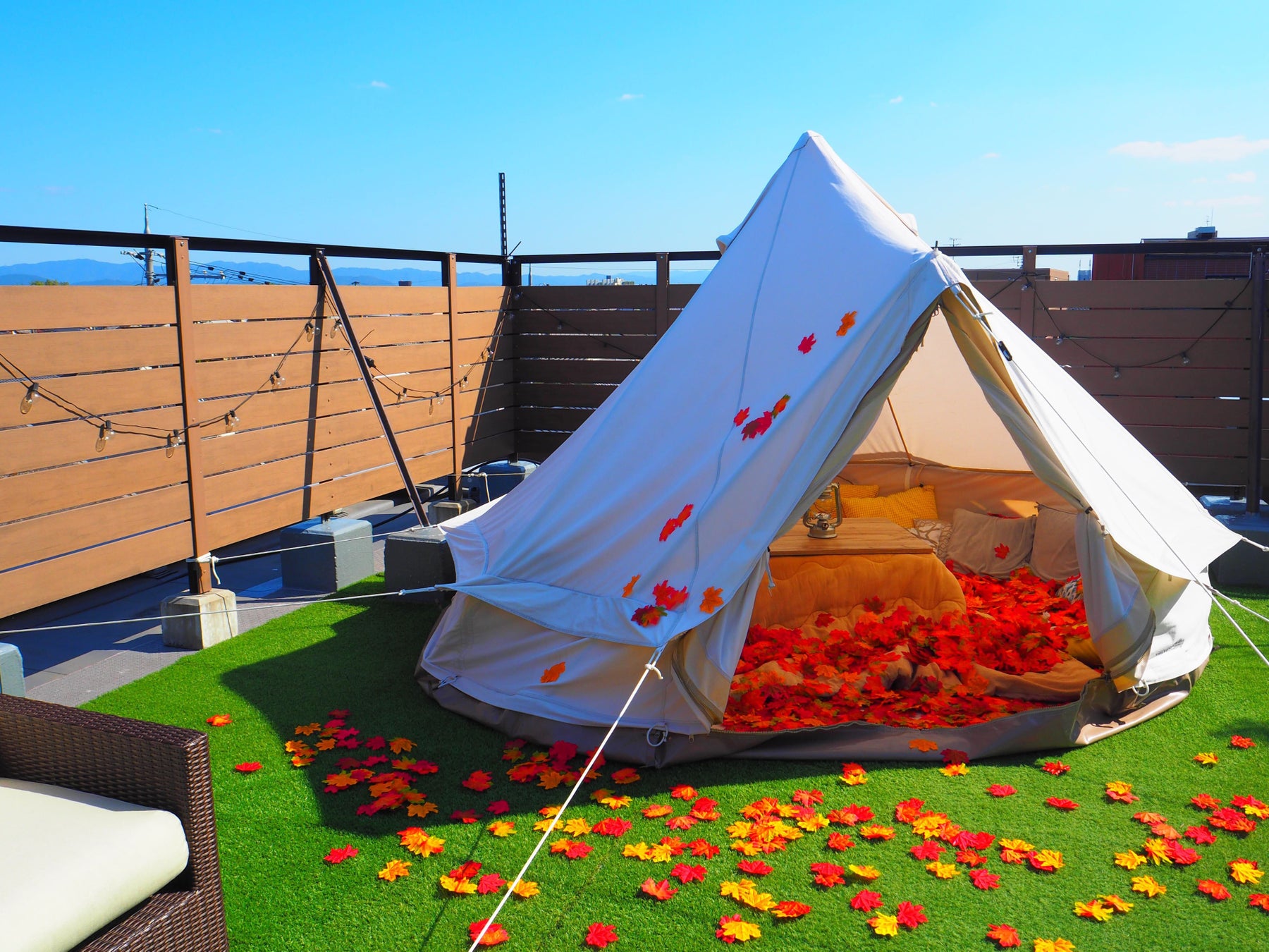 〈レビュー評価4.5点〉屋上テントが紅葉に彩られる!全室スイートルームのホテルThe GrandWest Arashiyamaが、11月までの期間限定で秋の夜長を贅沢に満喫する屋上空間を提供いたします