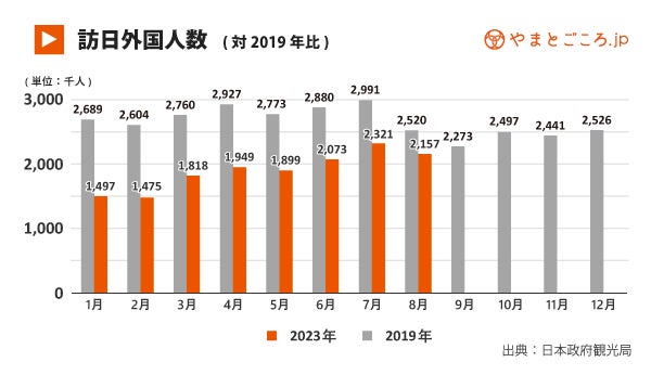 コロナ禍前の2019年と比較して2023年7月の訪日外客数は8割に迫る勢いで回復しており、インバウンド回復の遅れた中国も8月10日には日本団体旅行が解禁され、今後は中国市場を中心にさらに回復が進むと予想されています。(引用:日本政府観光局、訪日外客数(2023年9月推計値)、https://www.jnto.go.jp/news/press/20231018_monthly.html)(引用:株式会社やまとごころ、【訪日外国人数】2023年8月訪日客数215万6900人、2019年同月比85%まで回復。メキシコ、中東、カナダなどで伸長、やまとごころ.jp、https://yamatogokoro.jp/inbound_data/51436/)