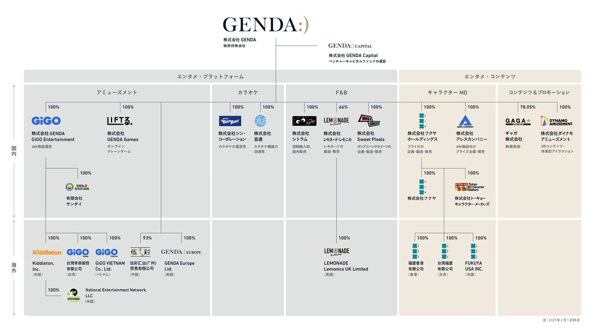 GENDAは、このAspirationの実現のため、グローバルにエンターテイメントのネットワークを構築し、世の中に流通する「楽しさの総量」を増やすことを目指すエンターテイメント企業です。アミューズメント、カラオケ、キャラクター・マーチャンダイジング、フード&ビバレッジ、コンテンツ&プロモーション(映画や体験型コンテンツ等)などエンターテイメントにおいて幅広く事業を展開しています。国内外で「GiGO」等のアミューズメント施設やカラオケチェーン店「カラオケBanBan」を合わせて約800店舗、ミニロケ(無人のゲームコーナー)を約11,000箇所運営しています。日本、米国、中国大陸、台湾、英国、中東、ベトナム、オランダにおいて事業展開しております。