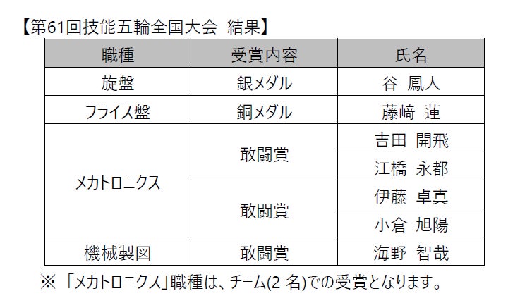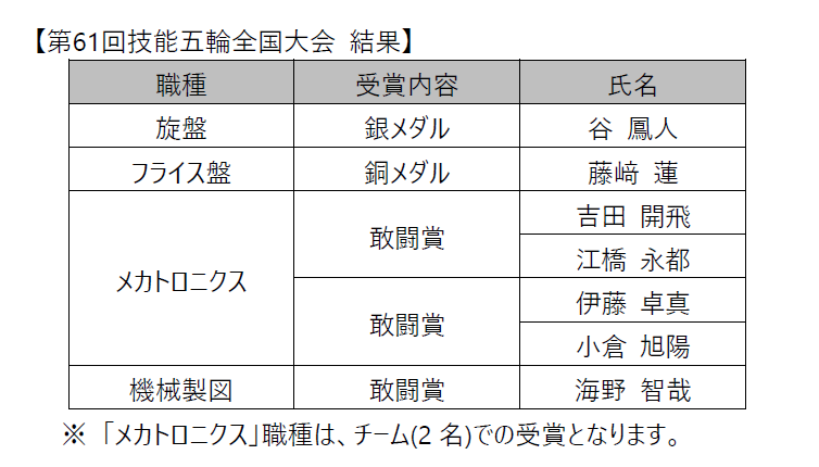 第61回技能五輪全国大会において「旋盤」職種で銀メダル、「フライス盤」職種で銅メダルを獲得および出場した全職種で入賞