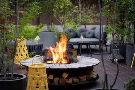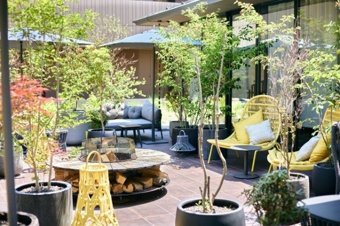 天窓からの陽光を受けたシンボルツリーがお出迎えする「ふふラウンジ」では、季節のアフタヌーンティーをお愉しみいただく時間や、落ち着いた雰囲気の中でグラスを傾ける夜のひとときなど、様々なシーンでご利用いただけます。プライバシーが保たれる背の高いソファ席や、シンボルツリーを囲む円形のカウンター席など、シーンに合わせてお好きなお席をお選びください。隣接したテラスでは、夕方からファイヤーピットに火が灯り、日中はさわやかな風を感じながら草木やハーブが揺れる穏やかな時間をお過ごしいただけます。