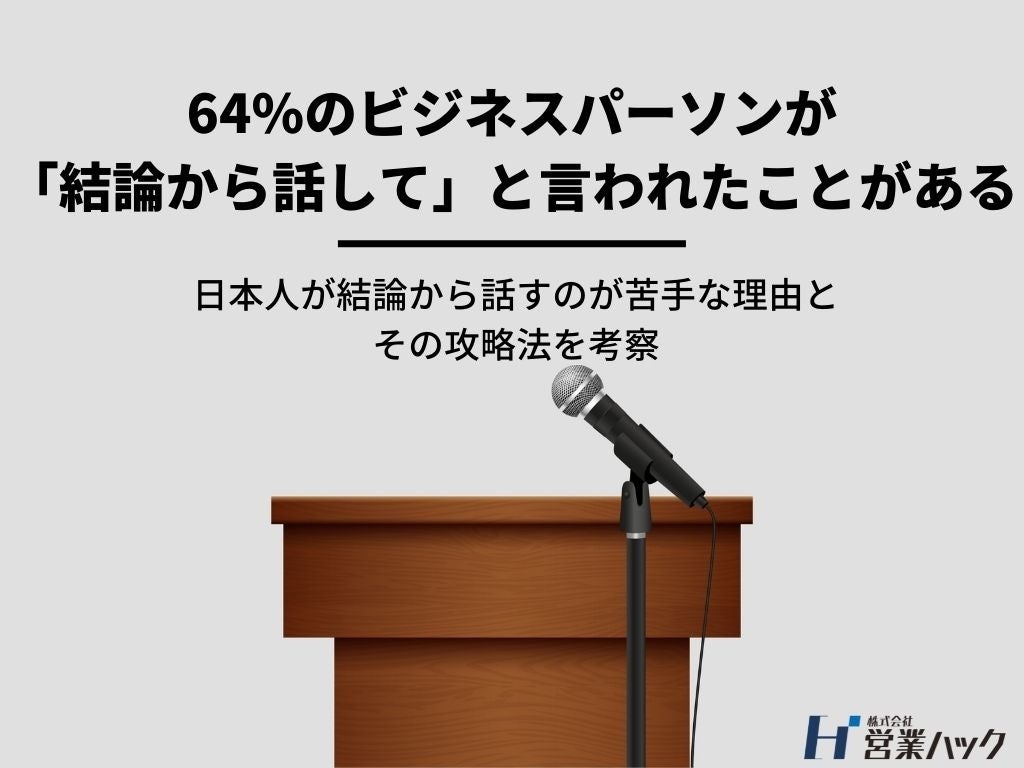 株式会社営業ハック(本社:東京都港区・代表:笹田裕嗣)は、社会人の「話し方」に関する調査を実施いたしました。400名を超えるビジネスパーソンに、上司や先輩から「結論から話して」と言われたことがあるか?とアンケートを取りましたので、その結果をここにご報告させていただきます。また回答内容から、日本人が結論から話すのが苦手な理由とその攻略法を考察しました。