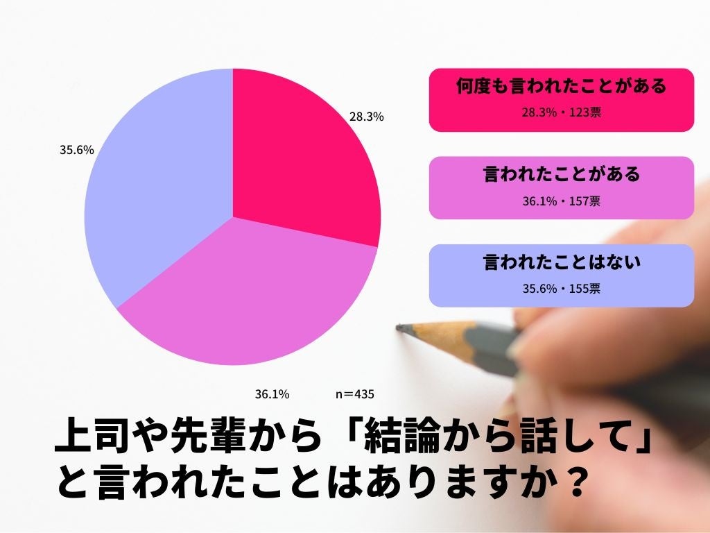 このように「結論から話せ」という会話が、ビジネスの現場では日々繰り返されているのではないでしょうか。多くのビジネスパーソンにその経験はあるのか、どのようにして結論から話す方法を身に付けていくのか、実態を調査すべく今回のアンケート実施に至りました。