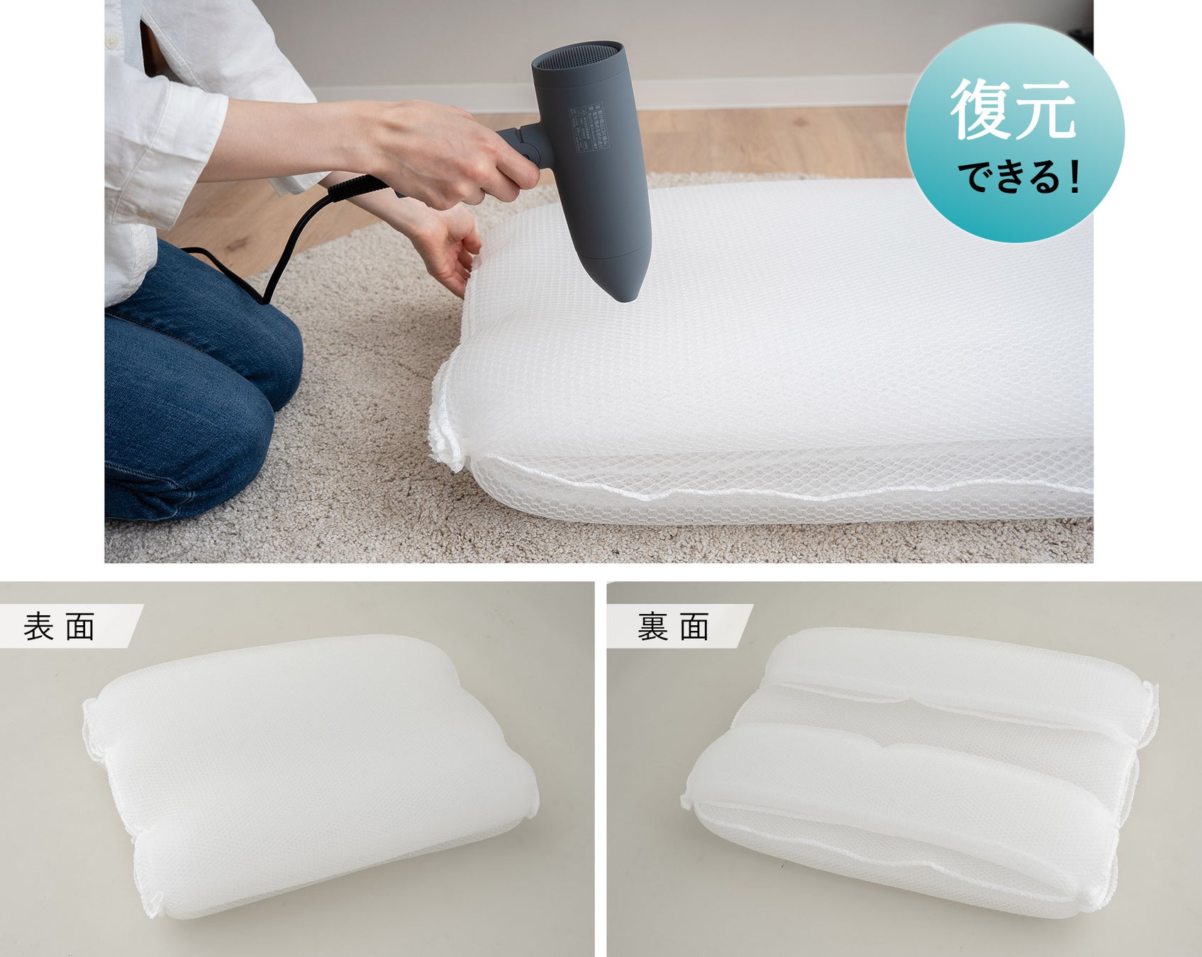 長く使っても簡単にボリュームを戻すことができる、再生力のある中材を採用しています。長期間の使用で厚みが減ってきた場合でもドライヤーの温風で復活。心地よい厚み・ふんわり感をキープできます。