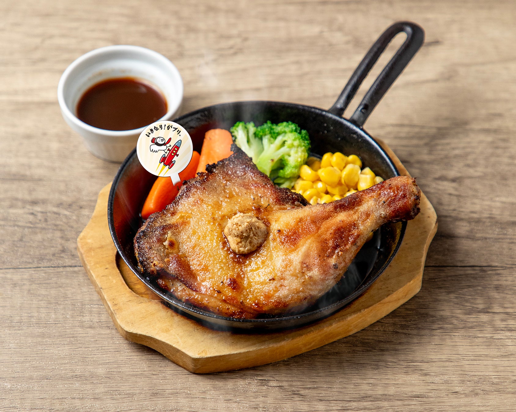 看板メニューである特製のスパイスの効いた骨付鳥に、「いきなり!ステーキ」秘伝のステーキソースとオリジナルペッパーペーストを使用。外はパリッと香ばしく、中は肉汁あふれるジューシーな仕上がりで、コク深い旨みとスパイスの効いたソースが、骨付鳥の美味しさをさらに引き立てます。