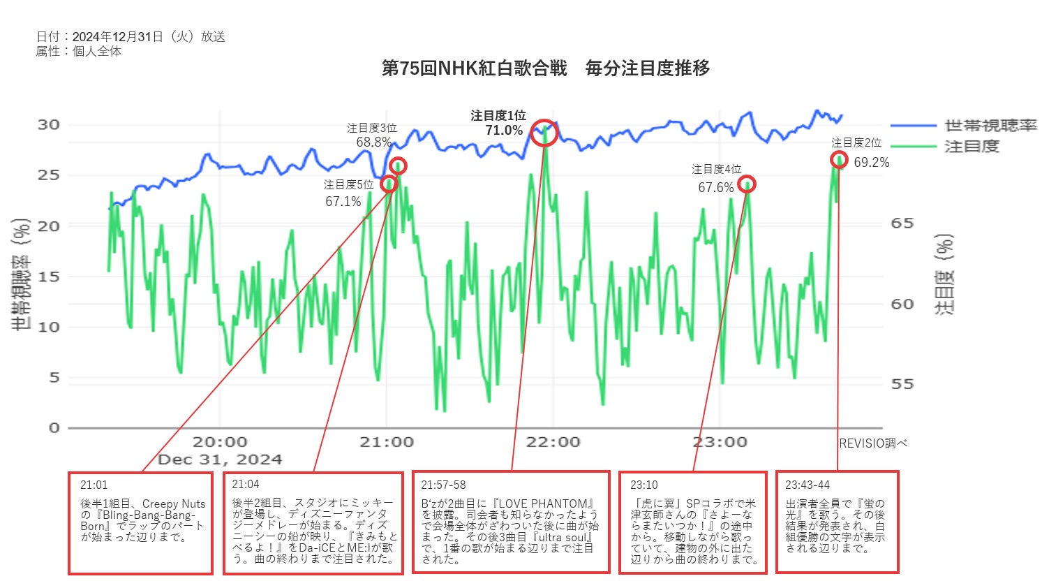 そんな2024年の紅白歌合戦で、視聴者が画面に「くぎづけ」になったのはどのシーンだったのでしょうか。REVISIOの注目度データで振り返ります。