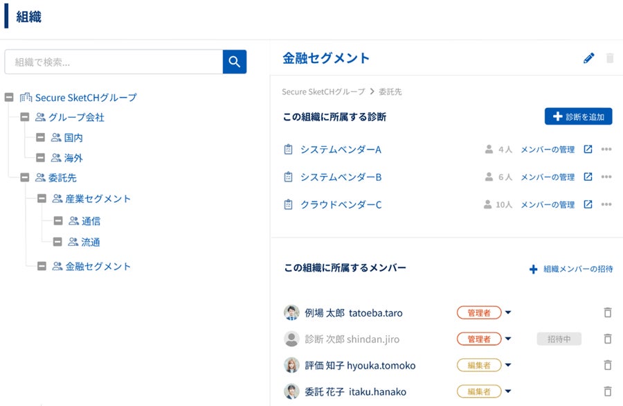組織単位で管理ユーザー(組織メンバー)の設定を行えるため、適切な権限管理を実現できます。組織メンバーは、自組織の企業の評価を閲覧することはできますが、上位の組織や同等レベルの組織の評価は閲覧できません。