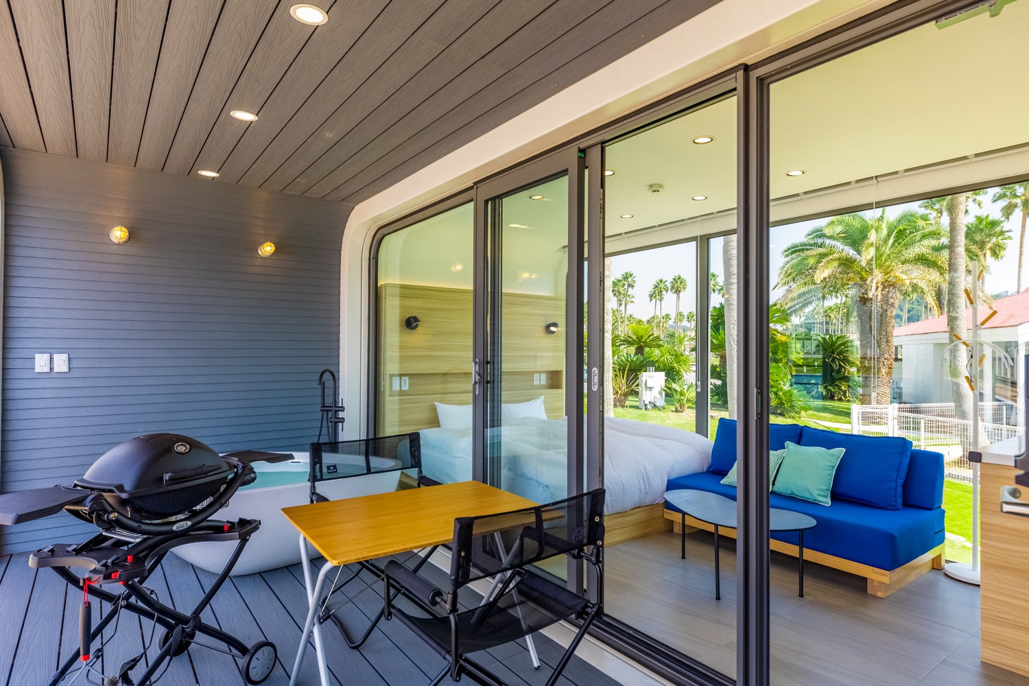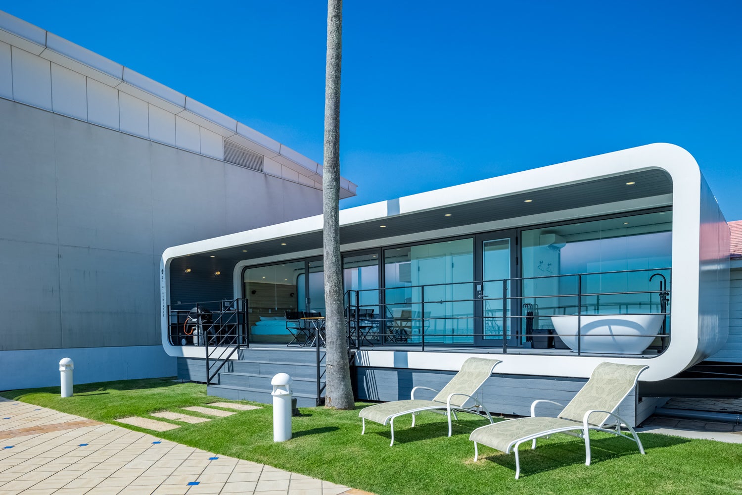 近未来的な丸みを帯びたフォルム。開放感ある一面のガラスに、そよぐ潮風を楽しむ広いテラスを有する客室は、オーシャンビューの好立地を存分に楽しんでいただく為の日本初の新たなデザイン。