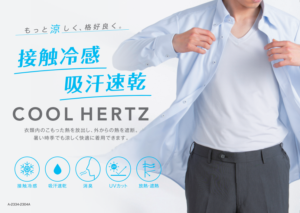 猛暑日が続く近年、夏は肌着を着用されない方も多く、通勤時に汗をかくことでワイシャツが体に張り付いて不快に感じることも多くなっていると思われます。「COOL HERTZ」は、肌に触れた部分がひんやり感じる接触冷感機能に加え、吸水速乾性にも優れているため汗をかいても乾きが早く、汗によるべたつき、不快感を軽減できる「着ることで涼しさを感じるアンダーウェア」です。