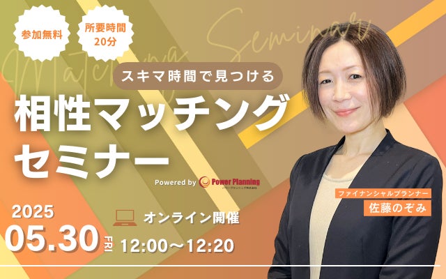 無料マネーセミナー提供サービス「アットセミナー」を運営しているパワープランニング株式会社が「5月30日(金) 12時」に「相性マッチングセミナー」というスキマ時間で自分に合ったFPを見つけられるオンラインセミナーを開催いたします。