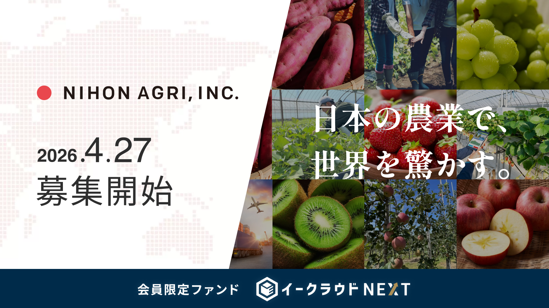 スタートアップ投資のプラットフォームを運営するイークラウド株式会社は、ミドル・レイターのスタートアップに特化した個人向け会員限定ファンド「イークラウドNEXT」の募集を、2026年4月27日(月)から開始します。本ファンドは、日本の農産物の生産から販売まで一気通貫で展開し、新たな産業構造を創出する株式会社日本農業に投資する予定です。