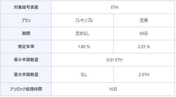 ETHのステーキングサービスでは、ロック期間の制限がない「フレキシブル」プランと、60日のロック期間がある「定期」プランをご用意しております。
