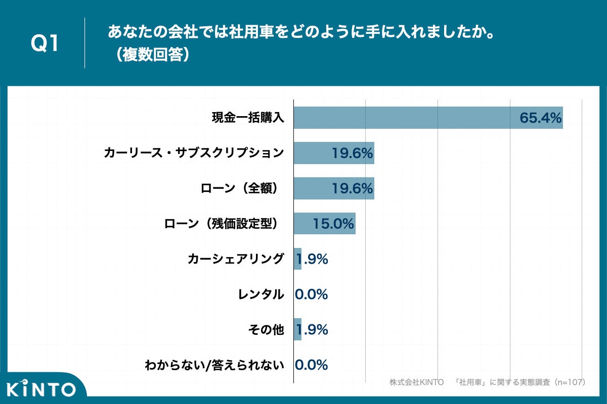 「Q1.あなたの会社では社用車をどのように手に入れましたか。(複数回答)」と質問したところ、「現金一括購入」が65.4%、「カーリース・サブスクリプション」と「ローン(全額)」がいずれも19.6%などという回答となり、「現金一括購入」が圧倒的に多数を占めました。