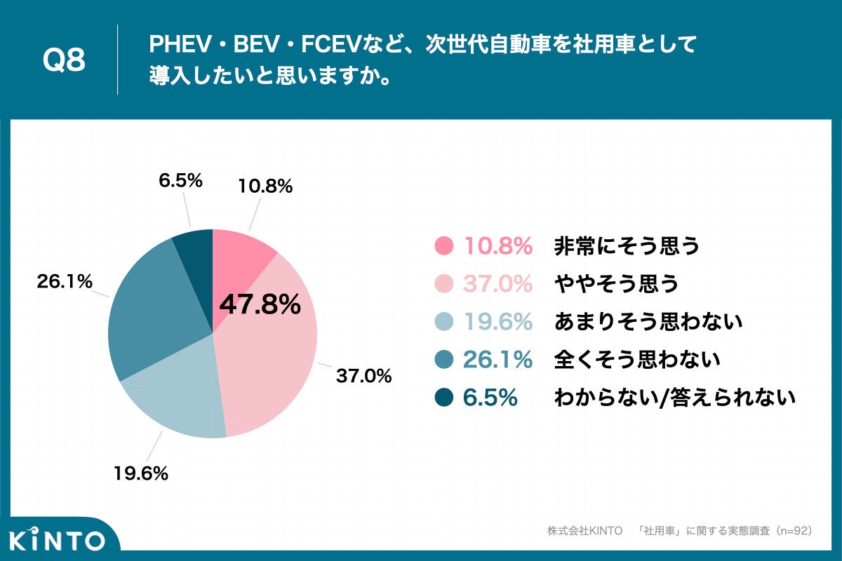 Q7で「ガソリン車」「ディーゼル車」と回答した方に、「Q8.PHEV・BEV・FCEVなど、次世代自動車を社用車として導入したいと思いますか。」と質問したところ、「非常にそう思う」が10.8%、「ややそう思う」が37.0%という回答となり、半数近くが導入の意向を示しました。