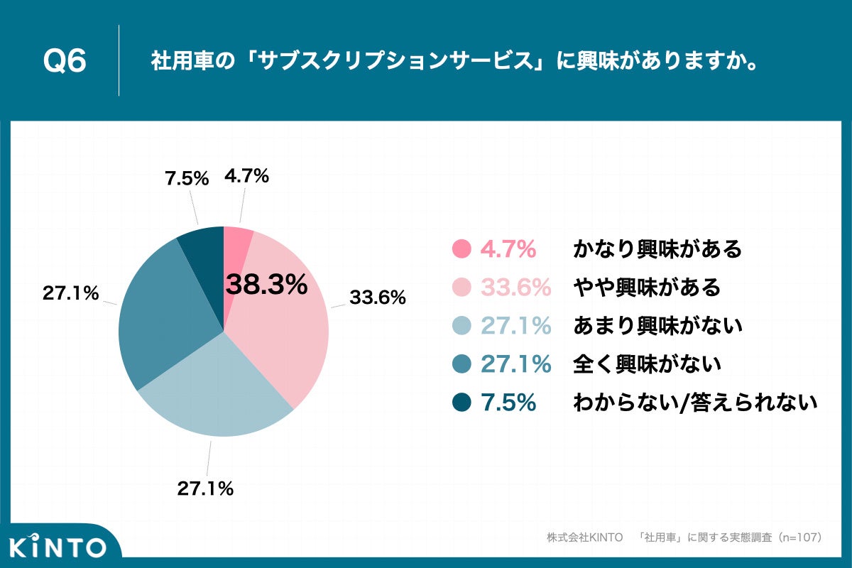 社用車の「サブスクリプション」について概要を説明したうえで、「Q6.社用車の「サブスクリプション」に興味がありますか。」と質問したところ、「かなり興味がある」が4.7%、「やや興味がある」が33.6%と、「興味がある」があわせて約4割を占める結果となりました。