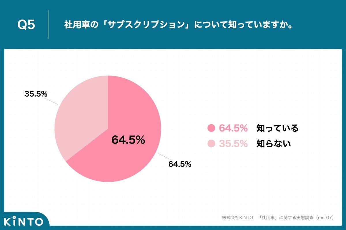 「Q5.社用車の「サブスクリプション」について知っていますか。」と質問したところ、「知っている」と回答したのは64.5%と、全体の3分の2近くを占めました。
