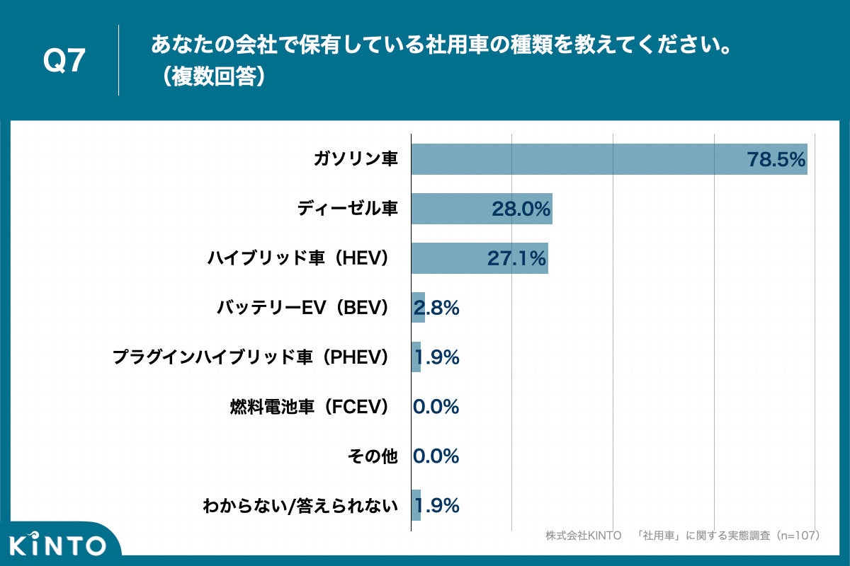 「Q7.あなたの会社で保有している社用車の種類を教えてください。(複数回答)」と質問したところ、「ガソリン車」が78.5%と圧倒的多数を占め、続いて「ディーゼル車」が28.0%、「ハイブリッド車(HEV)」が27.1%という回答となりました。一方、バッテリーEV(BEV)は2.8%、プラグインハイブリッド車(PHEV)は1.9%と、いずれも少数にとどまりました。