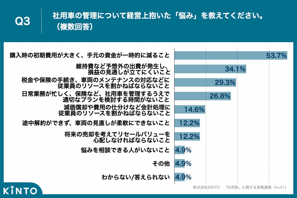 Q2で「ある」と回答した方に、「Q3.社用車の管理について経営上抱いた「悩み」を教えてください。(複数回答)」と質問したところ、「購入時の初期費用が大きく、手元の資金が一時的に減ること」が53.7%とトップとなり、続いて、「維持費など予想外の出費が発生し、損益の見通しが立てにくいこと」が34.1%、「税金や保険の手続き、車両のメンテナンスの対応などに従業員のリソースを割かねばならないこと」が29.3%という回答となりました。