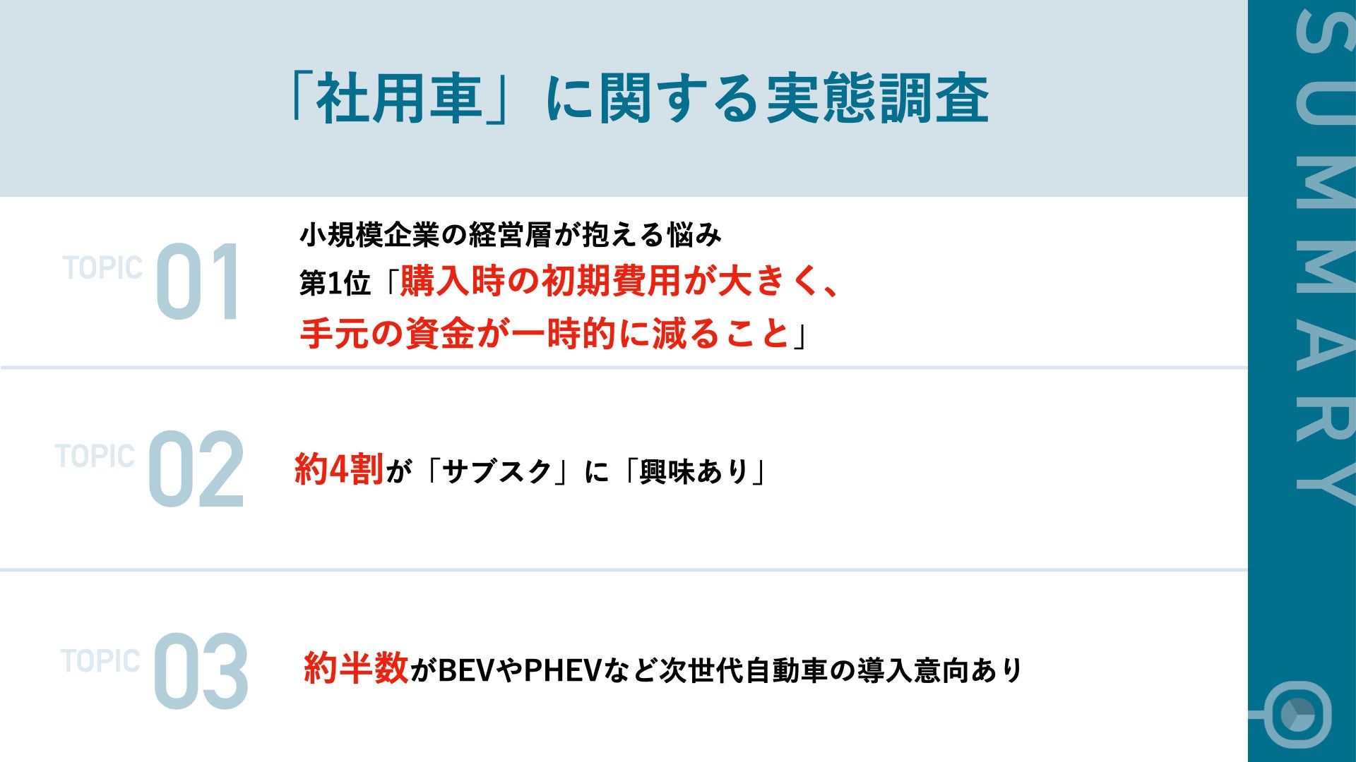 今回、従業員20名以下の小規模企業を経営する約100人を対象に、「社用車」に関する実態調査を実施しました。