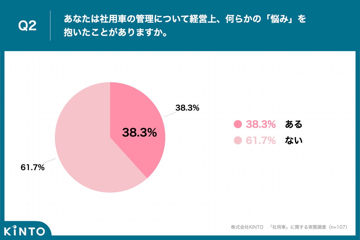 「Q2.あなたは社用車の管理について経営上、何らかの「悩み」を抱いたことがありますか。」と質問したところ、「ある」が38.3%と、約4割が悩みを抱いたことがあることがわかりました。