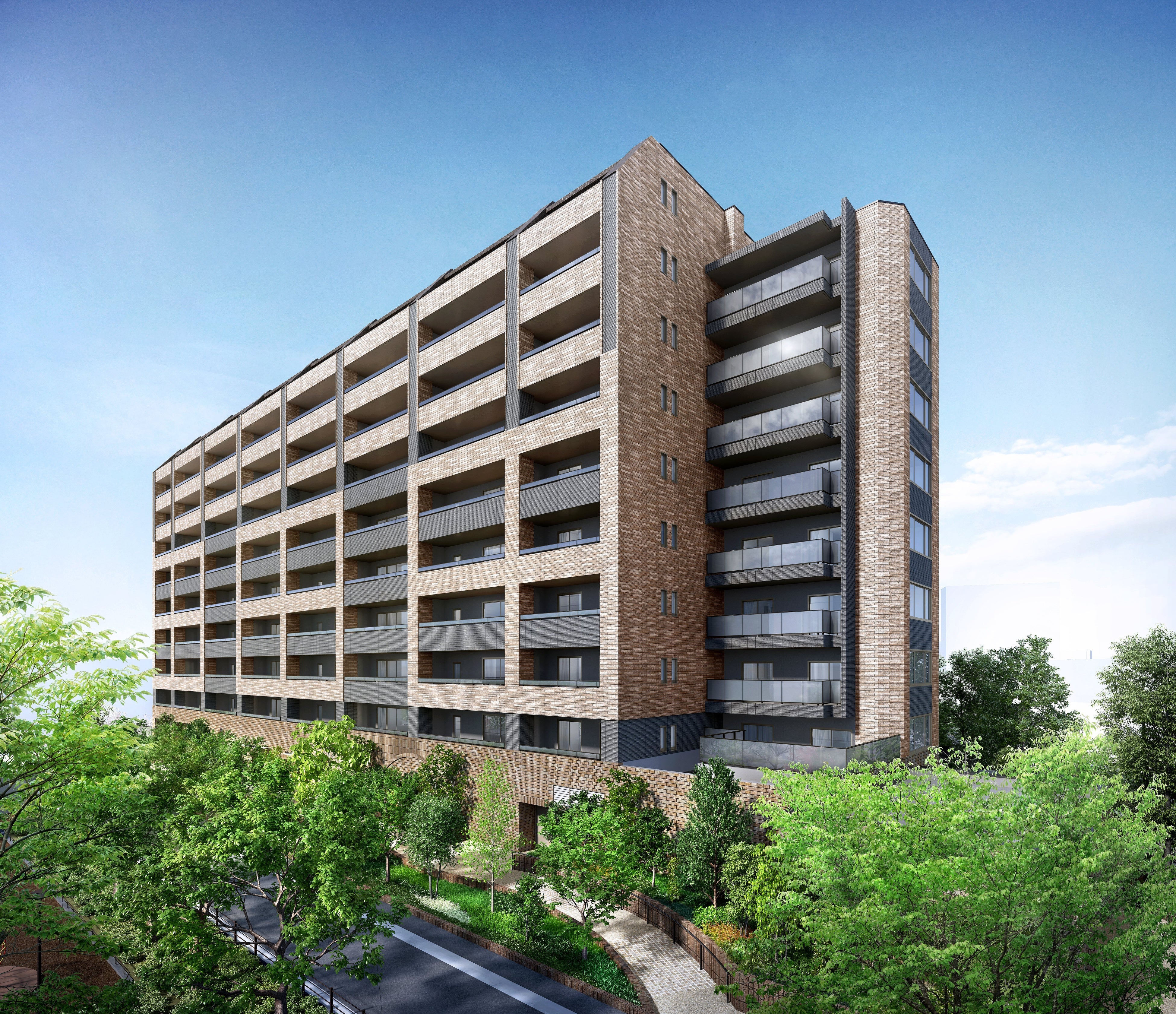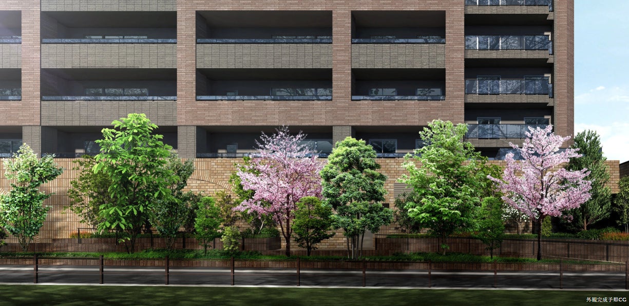 外観は、小田急線の旧電車基地跡地という“鉄道の記憶”から想起したレンガタイルをデザインの中心となる素材に採用しました。また、「経堂テラスガーデン」の“歩きたくなるまち・経堂”というコンセプトを継承し、グリーンプロムナードやユリの木通りと結ばれる遊歩道を敷地内に整備。目前に広がる山下公園と呼応するように、季節の移ろいが日々味わえる多様な樹々や花々の植栽を施し、街と一体になった新たな並木道を仕立てます。