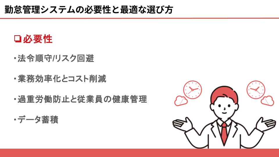 「システムでどんな課題を改善したいか」「自社で採用している変形労働制に対応できるシステムはあるか」といった、自社の課題や優先したいポイントを念頭において検討することで、スムーズに選定を進められます。