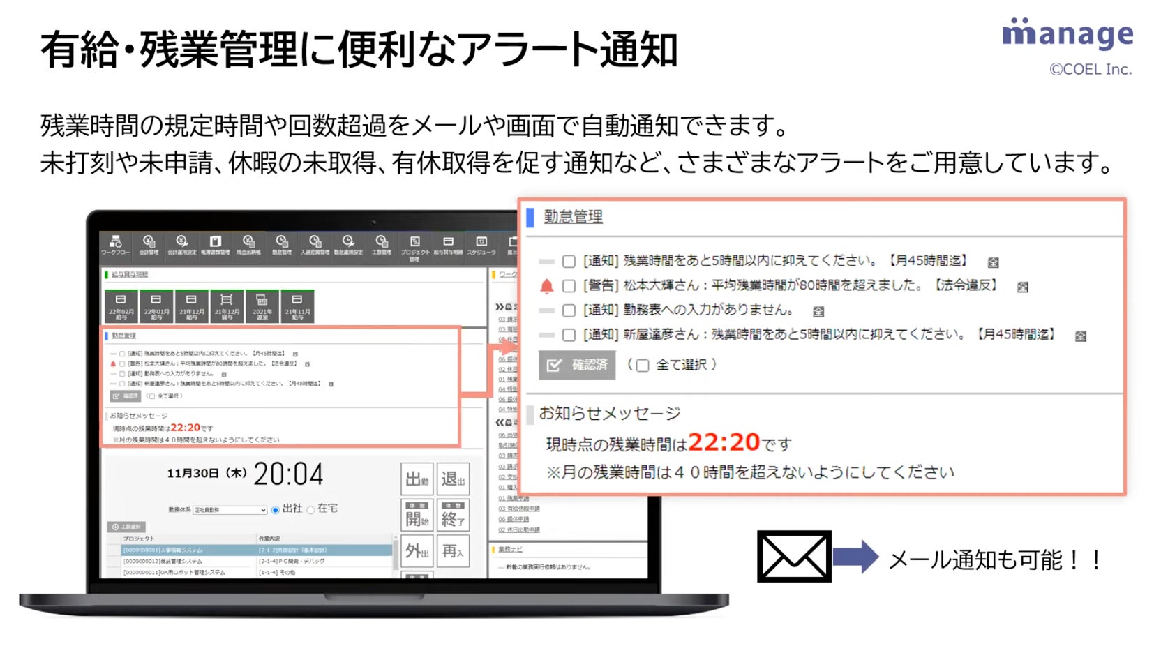manageの強みは、なんといっても種類が豊富なアラート機能。打刻・申請漏れなど基本的なものから、有給取得日数の不足や残業時間の超過など、幅広くカバーされています。