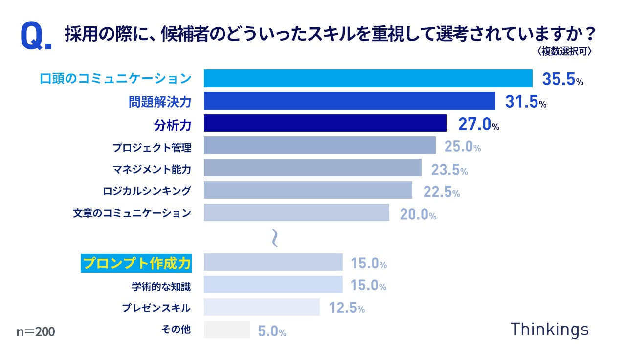 「候補者のどのようなスキルを重視して選考するか」と質問したところ、「口頭のコミュニケーション」が35.5%、「問題解決力」が31.5%、「分析力」が27.0%となりました。AIの活用に必要な「プロンプト作成力」と回答した人は15%にとどまりました。