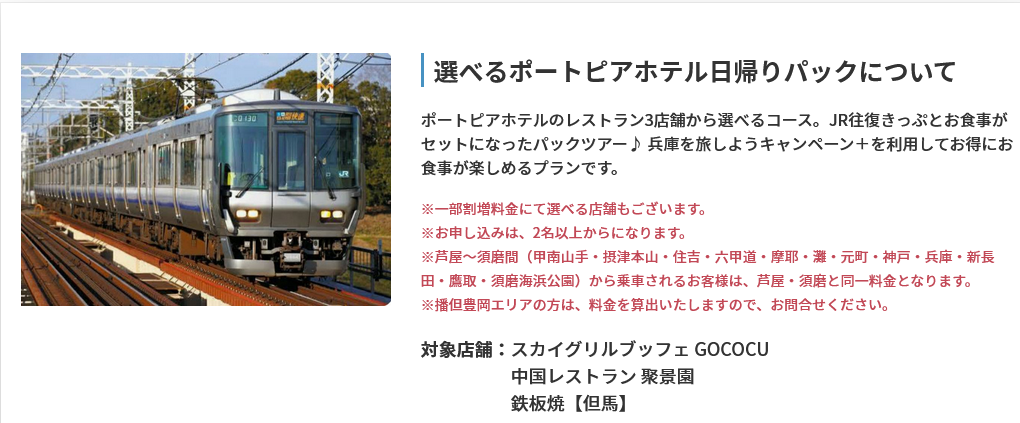 株式会社フォーティーズ(本社:大阪市鶴見区、代表取締役 岡武史)は「ふるさと応援!ひょうごを旅しようキャンペーン」の対象商品としてポートピアホテルのレストランとJR往復きっぷがセットになったパックツアーの販売を開始しました。