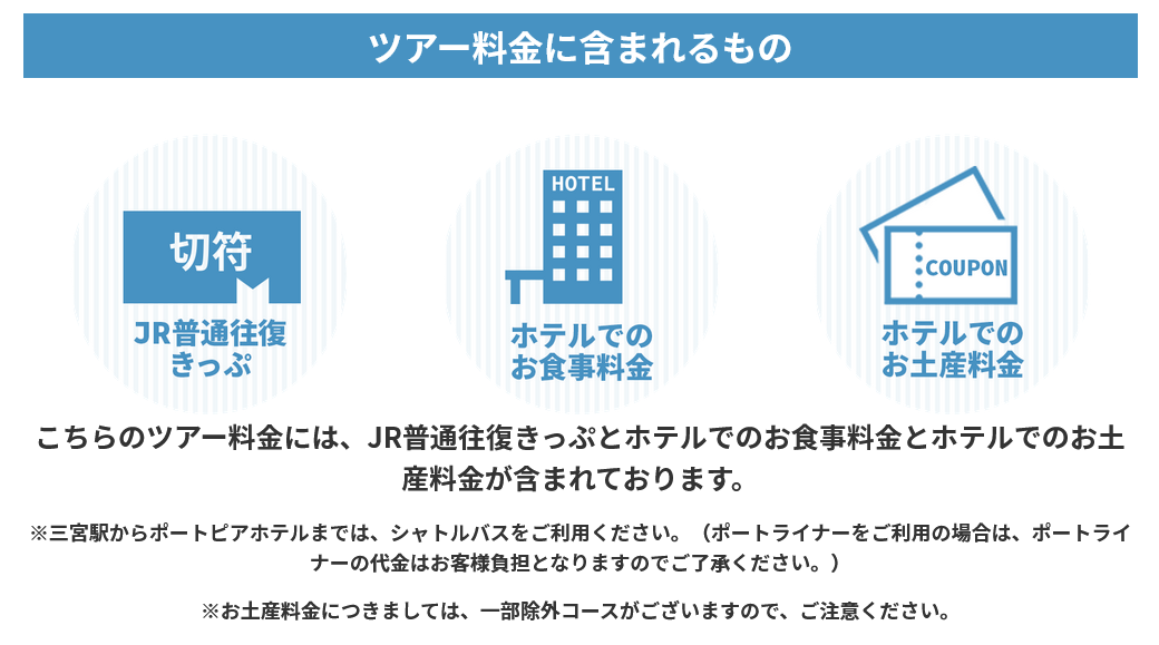【8月31日迄延長!兵庫県・京都府・鳥取県・岡山県・香川県民限定!】往復のJRきっぷ付き この価格 ポートピアホテルで食事してお土産券3,000円券付いて4,000円!の日帰りパック