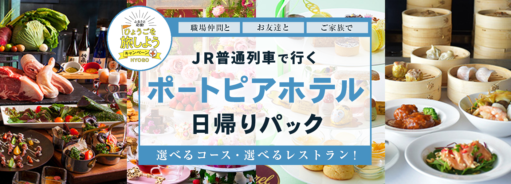 ポートピアホテルのレストラン3店舗から選べるコース。JR往復きっぷとお食事がセットになったパックツアー♪ 兵庫を旅しようキャンペーン+を利用してお得にお食事が楽しめるプランです。