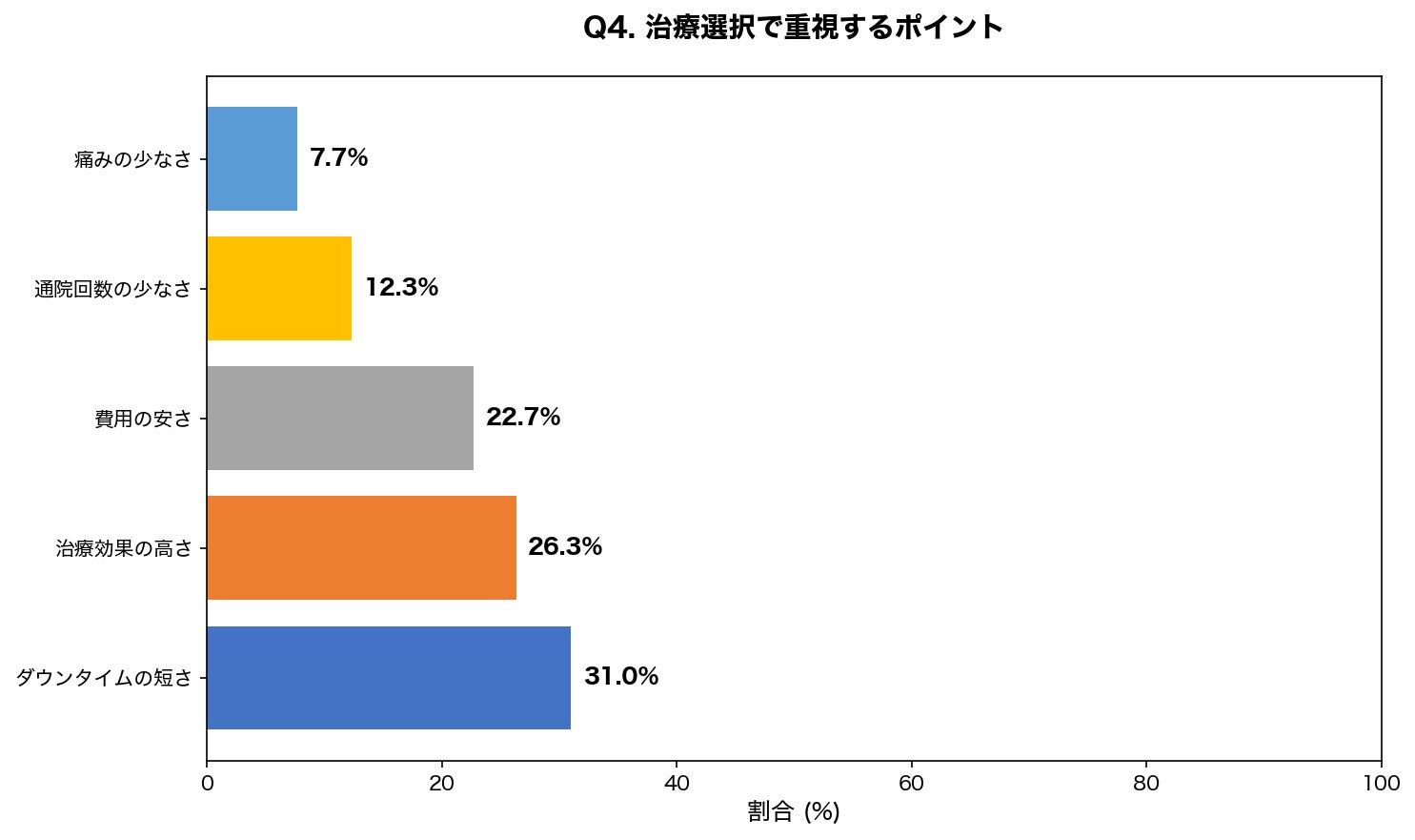 「費用が心配」が35.3%で最多でしたが、「どの治療法が良いかわからない」も27.7%と高く、情報不足が治療をためらう大きな要因となっています。適切な情報提供とカウンセリングの重要性が示唆されました。