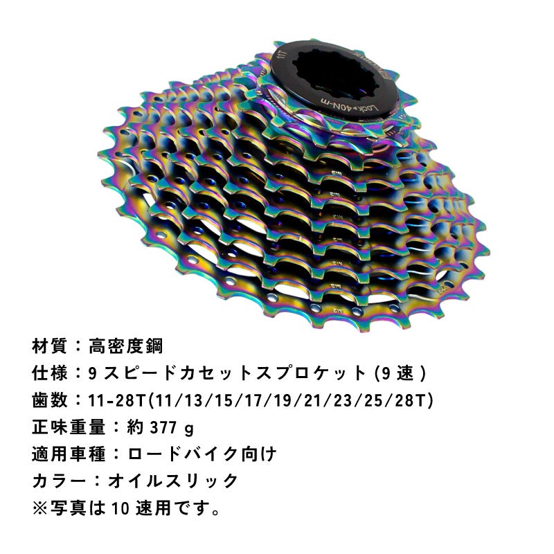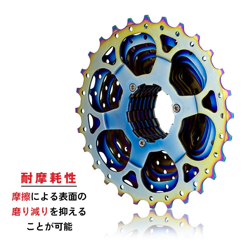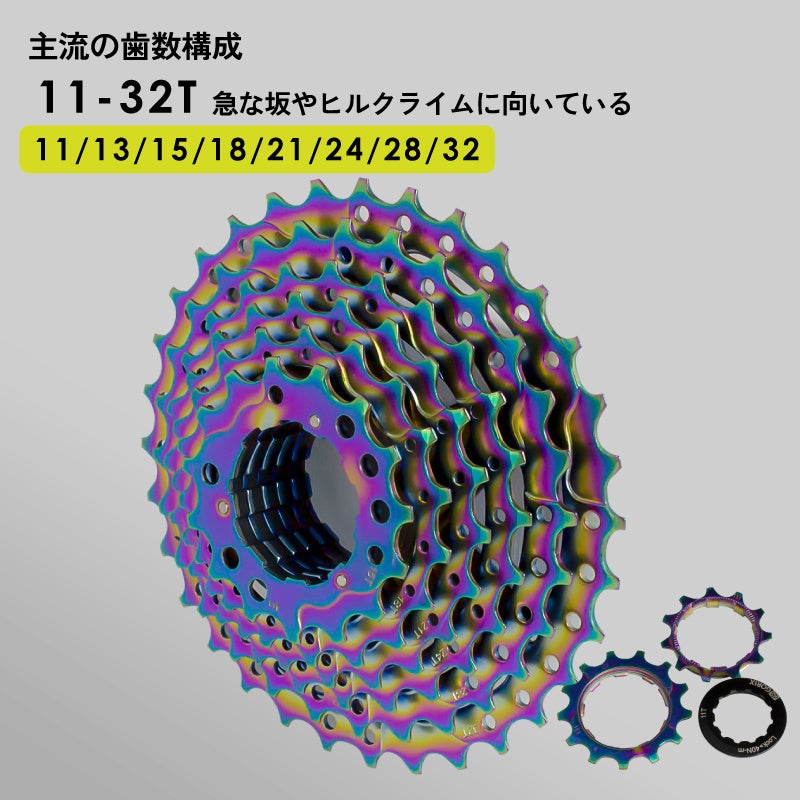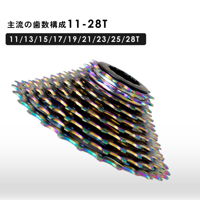 オイルスリック色のスプロケット。歯数構成は9速がメジャーな11-28T、8速がヒルクライムや登りで活躍する11-32T。耐久性ある高密度鋼の材質で、耐摩耗性-摩擦による表面の磨り減りを抑えられます。