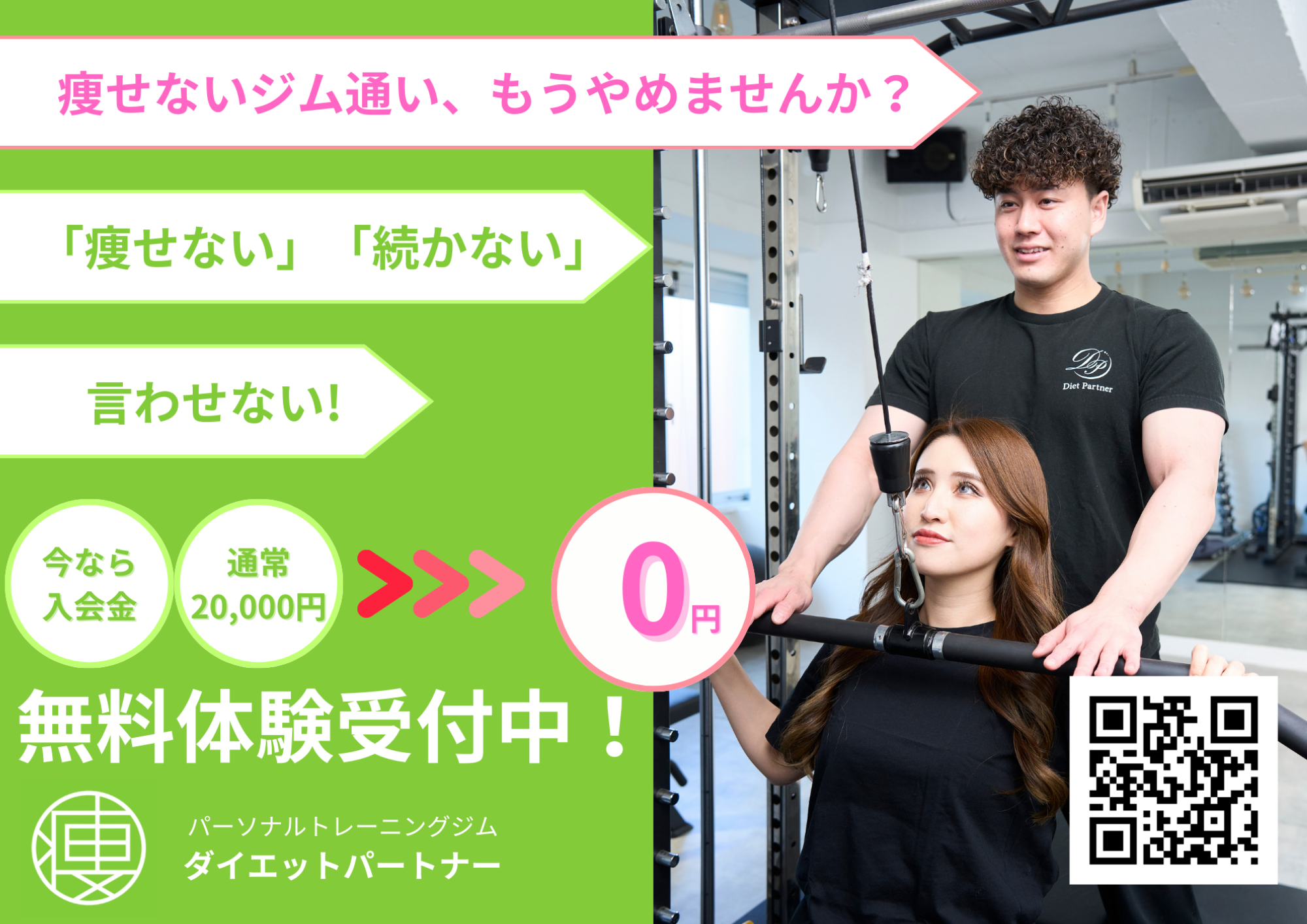 ダイエットパートナーでは名前の通り"ダイエット"はもちろんのこと、コロナで運動習慣が全くなくなってしまった方や、今までジムに通ったものの続かなかった方へ、トレーナーがマンツーマンでモチベーション向上・トレーニング指導を行うことで、効率良くトレーニングができ嫌でも運動習慣が身につくよう、全力でサポートするジムです!