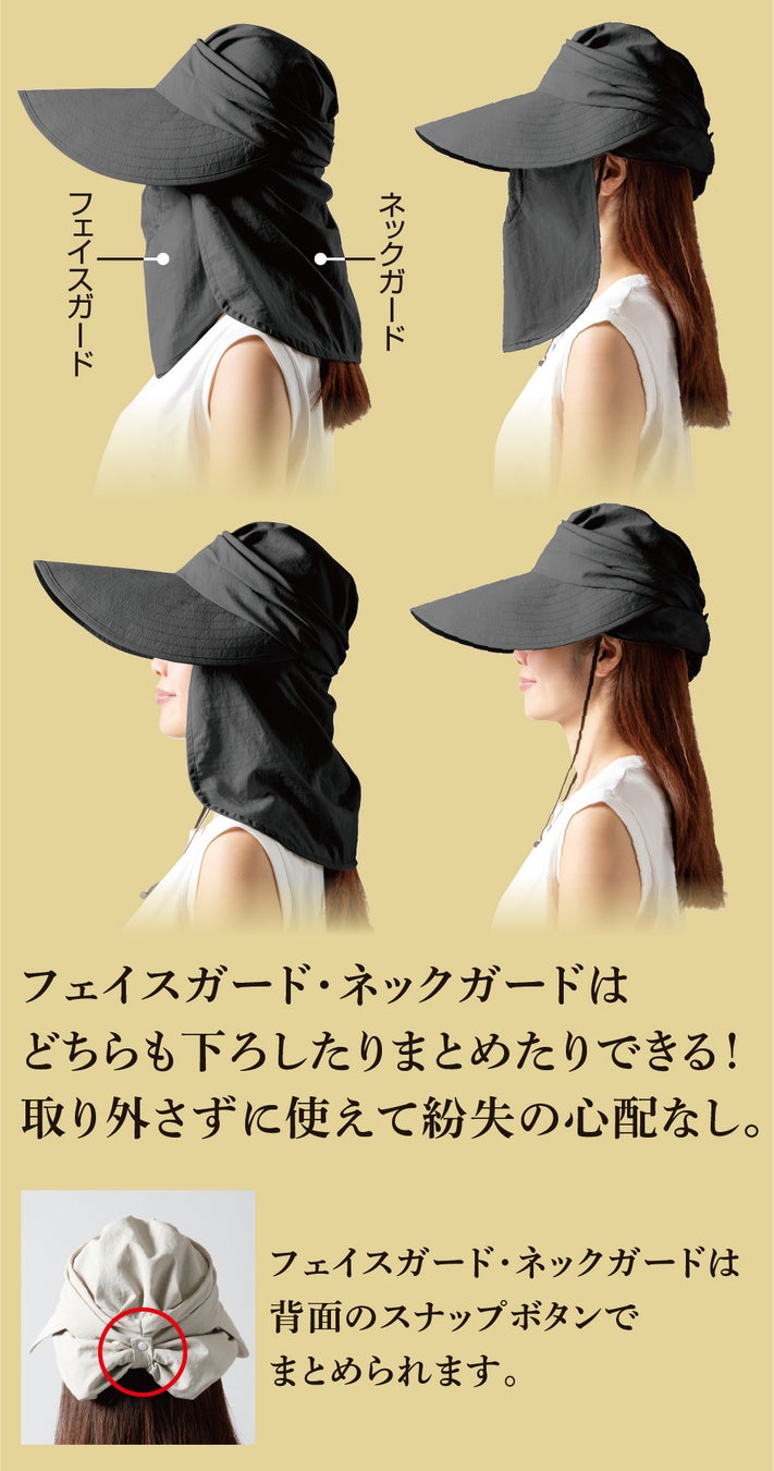 ガードを取り外さずにスタイルをチェンジできる紫外線対策帽子です。