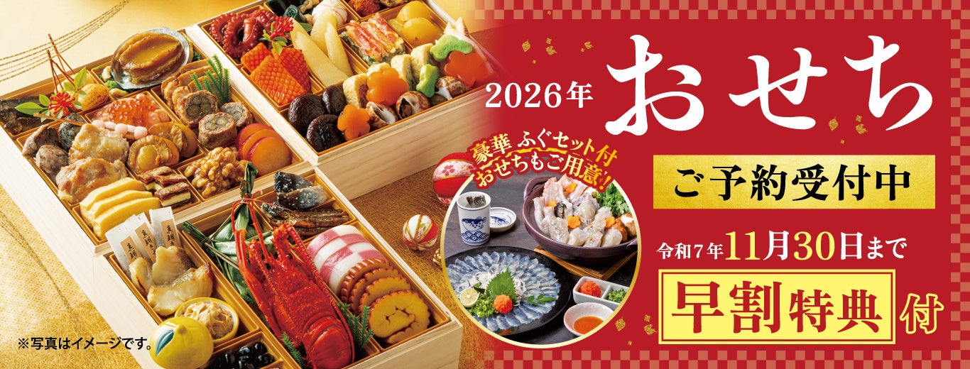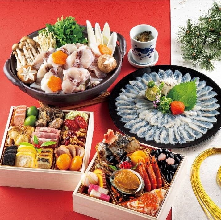 2025年11月30日 までのご予約で最大5,000円お得。「トラフグ薄造り・鍋セット付きおせち」など全5種をラインナップ。今年はクリスマスにも最適な「洋風オードブル」が登場!