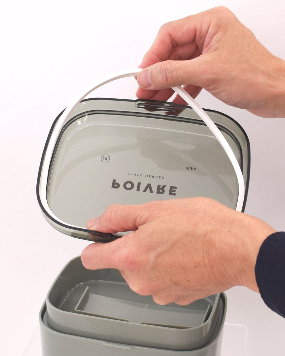 透明なフタはベルトや止め具がいらないワンタッチで開け閉めできる設計。パーツが少なく軽量なので持ち運びしやすく、お手入れも簡単です。