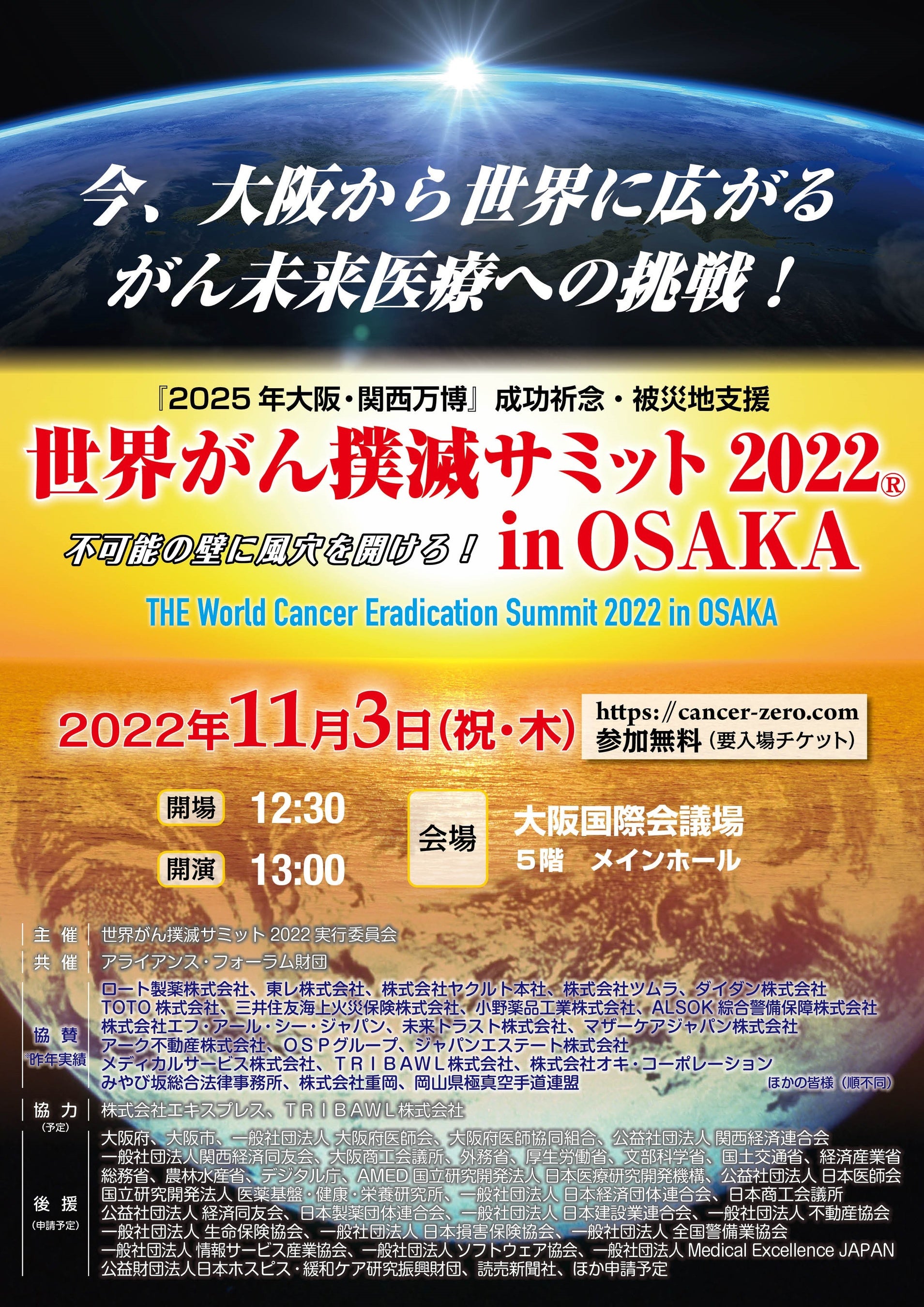 2022年11月3日(木・祝)午後1時より大阪国際会議場で開催される『世界がん撲滅サミット2022 in OSAKA』(https://cancer-zero.com)。