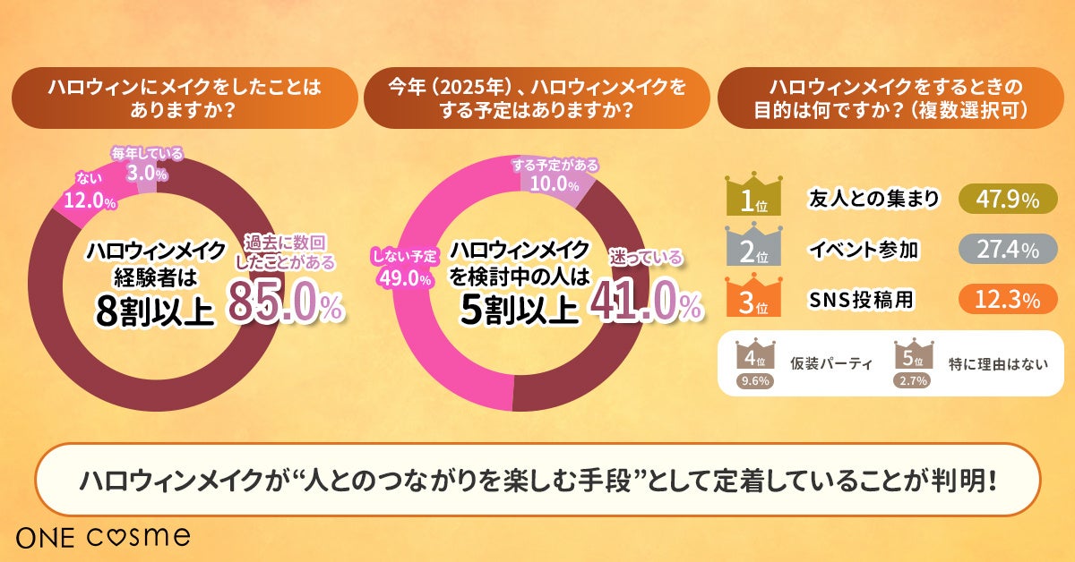 今回の調査からは、ハロウィンメイクに対する関心の高さとともに、「映え」だけでなく「完成度」や「落としやすさ」など、実用性や肌への配慮を重視する傾向が明らかになりました。