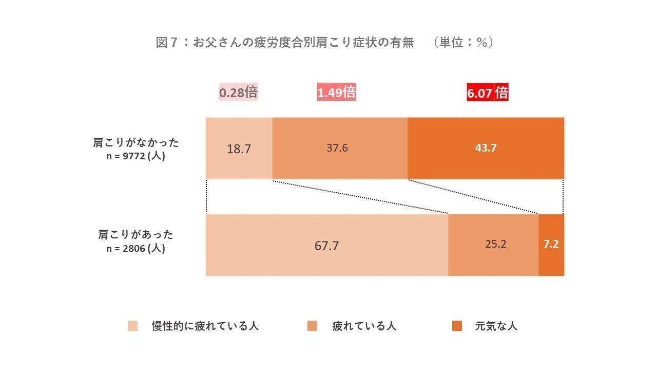 肩こりと疲労度合の関係性について見ると、肩こりを抱えているお父さんのうち、元気な人は7.2%と非常に少ないことがわかりました。さらに、ほとんど肩こりがなかったと回答したお父さんと比較すると、6.07倍となり前回調査から大きな傾向は変わらず、肩こりと疲労の相関が見られます。
