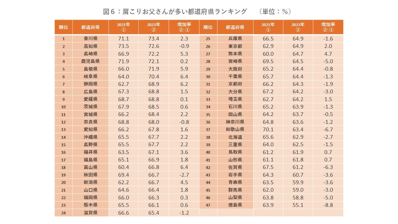 2021年の順位は、1位高知県、2位鹿児島県、3位香川県、4位和歌山県、5位宮崎県で、これと比較すると、香川県、高知県、鹿児島県では引き続き肩こりに悩むお父さんが多いことがわかりました。