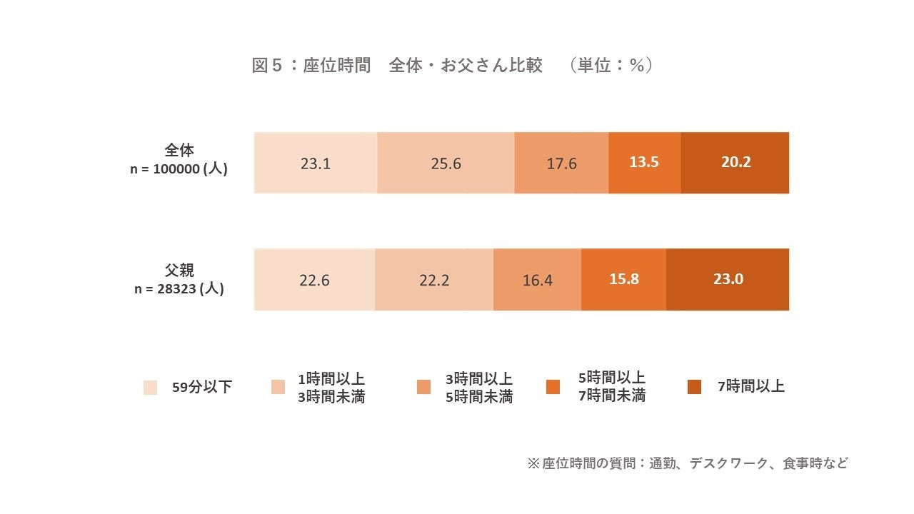 またお父さんの座位時間を見ると、全体と比較して5時間以上の座位時間が多い傾向にあります。在宅ワーク、オンライン会議の普及など、働く環境が多様化していることに加え、多くの職種で長時間同じ姿勢で座っていることや、デジタルデバイスと向き合う時間が長いことが体の血流の滞りを引き起こし、首筋や肩こりの悩みが発生していることが推測できます。このことから、こまめな休憩やストレッチで筋肉を動かすことが重要であると明確になりました。