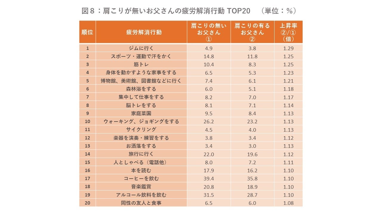 肩こりが無いお父さんの疲労解消行動TOP20公開! 身体を動かすことや、「脳トレ」や「お洒落をする」、「コーヒーを飲む」など父の日にプレゼントしやすい項目もランクイン