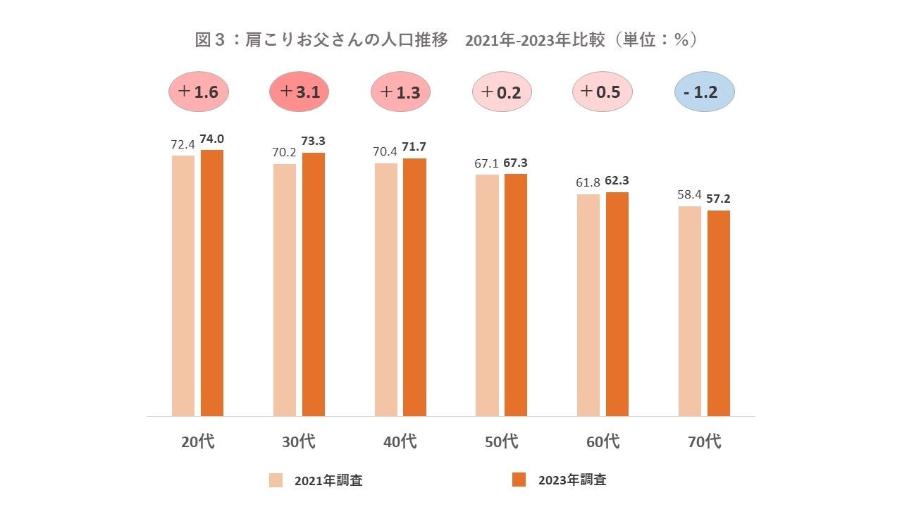 年代別に肩こりの頻度を見ると、肩こりを抱えている割合が7割を超えて高いのは、20~40代の若年層のお父さんで、特に30代のお父さんが2021年と比較すると+3.1%と最も増加傾向にあることがわかりました。