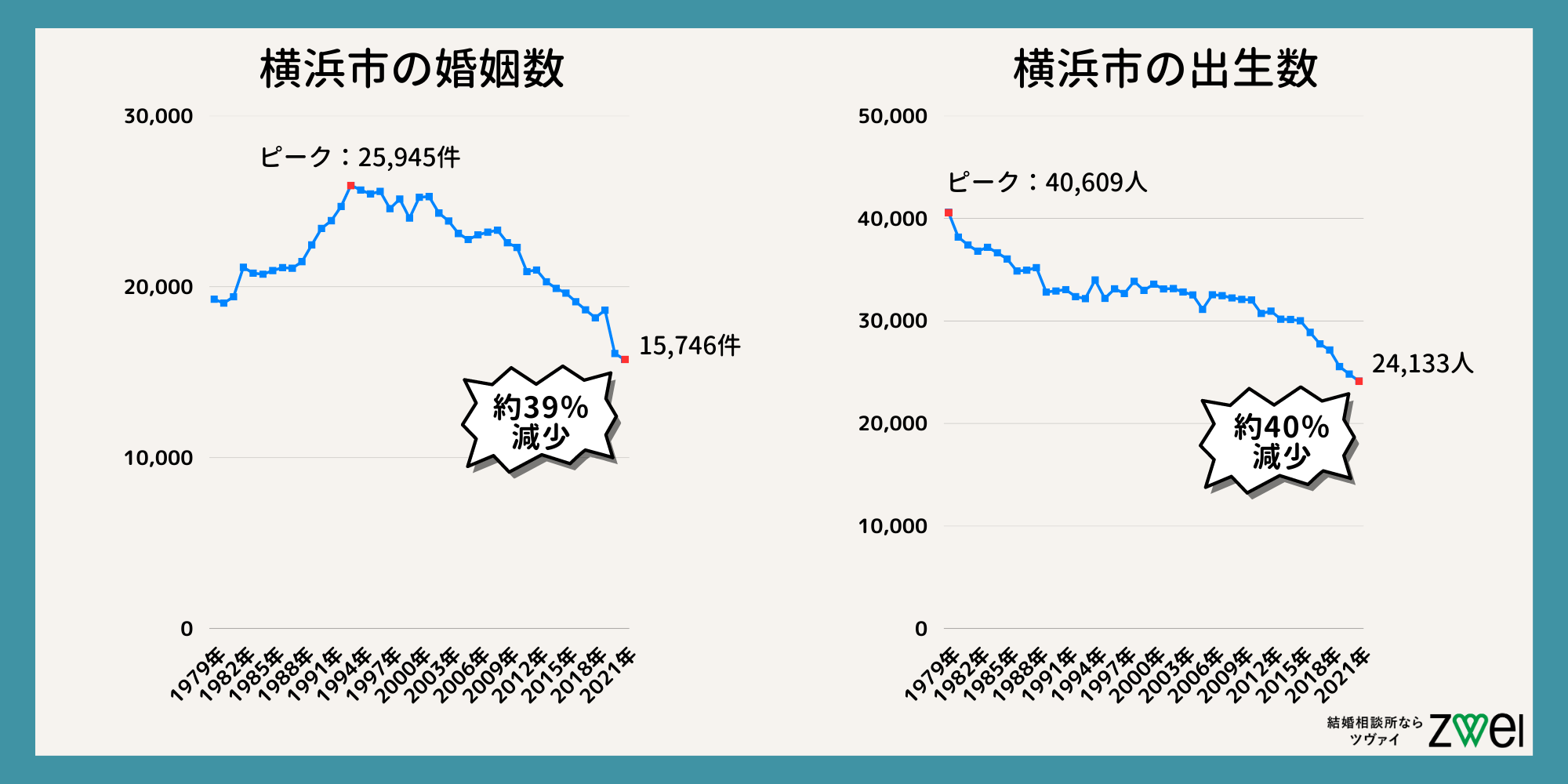 神奈川県の婚姻数・出生数は年々減少しており、2011年に50,806件だった婚姻件数は、10年後の2021年には38,664件と約24%減少(※)。出生数は2011年の76,000人から、10年後の2021年には58,836人と約23%減少しています(※)。