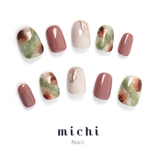 たまには違ったカラーが楽しみたい!という方におすすめなのがこちらのグリーンのネイル。くすみカラーなので、肌ともなじみます。ブラウンとグレージュカラーのネイルがグリーンの大理石デザインを引き立てます。高級感のあるデザインはシンプルなお洋服と組み合わせてをワンランク上のおしゃれさを引き出してくれます。
