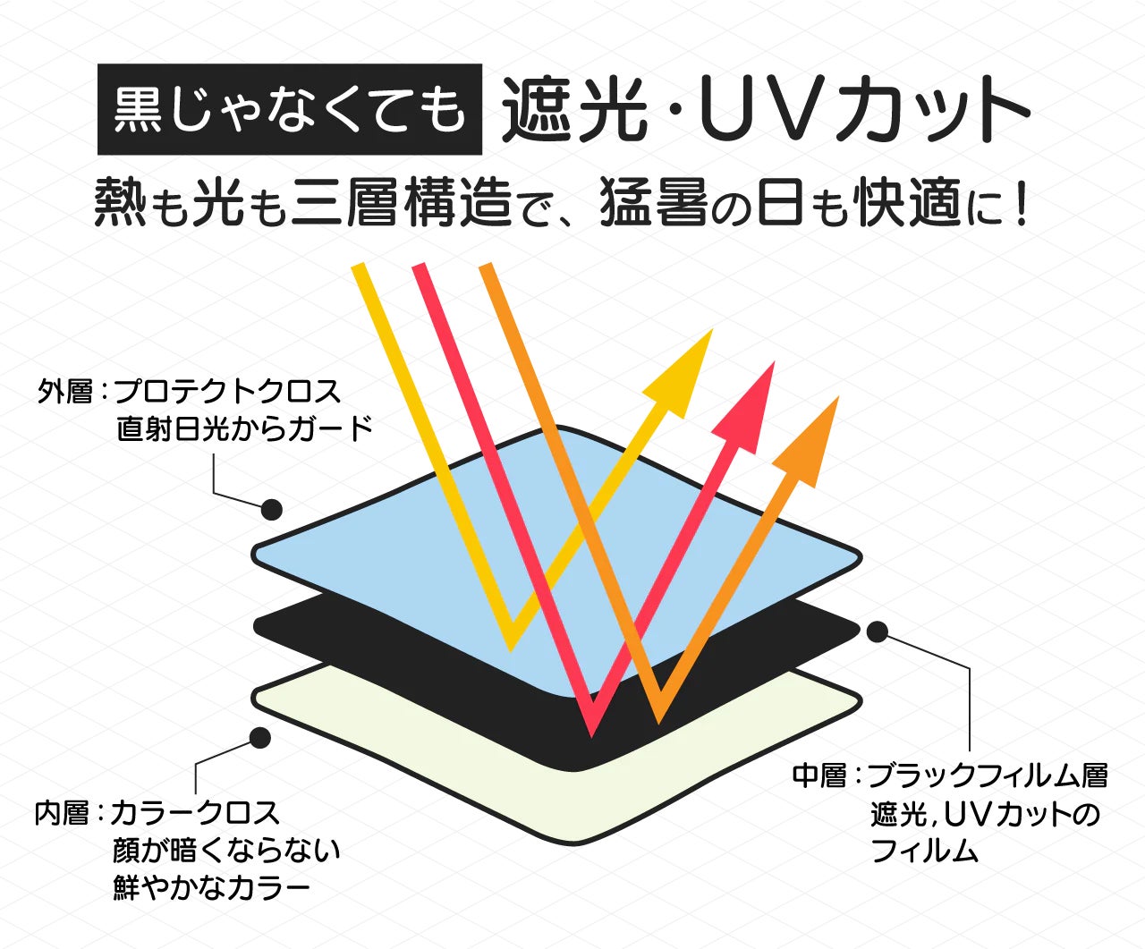 表側(プロテクトクロス)と裏側(カラークロス)の生地の間に、真っ黒な「ブラックフィルム層」をサンドイッチのように挟み込むことによって、表も裏もカラー生地ながら、遮光・UVカットを非常に高いレベルで実現しました。