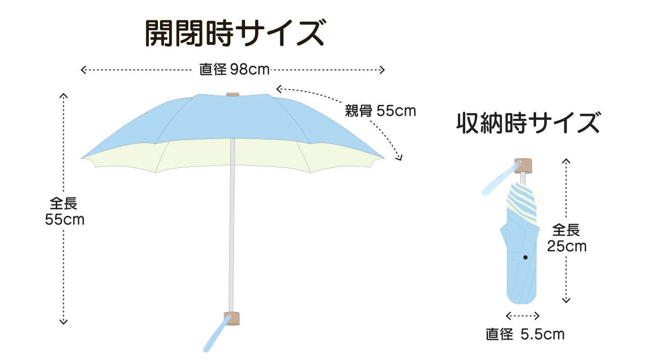 サイズ:開閉時・・・直径98cm、親骨55cm、全長55cm 収納時・・・全長25cm、直径5.5cm