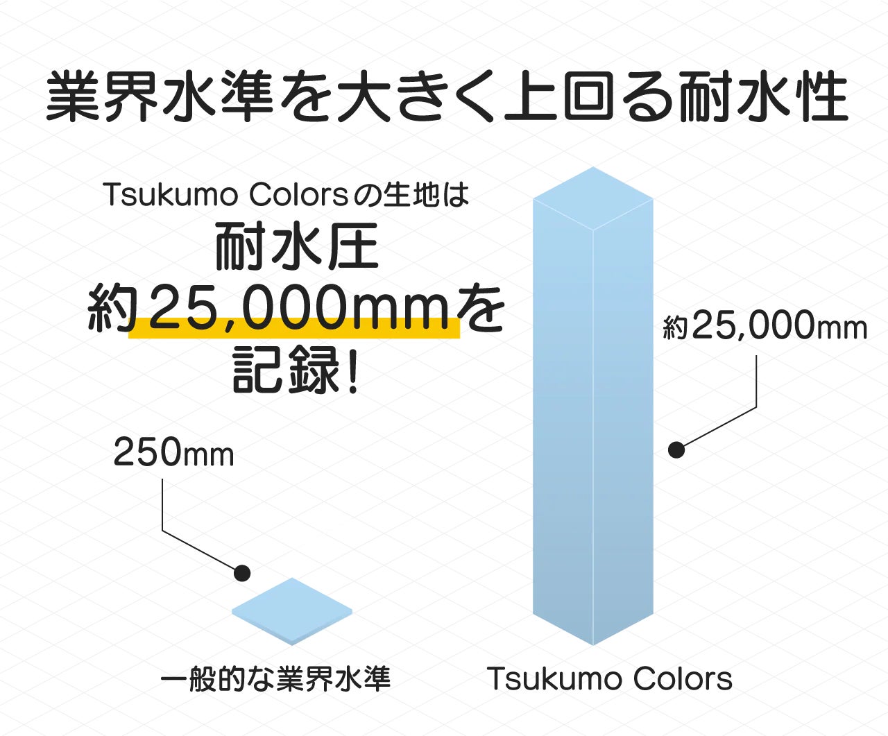 耐水圧測定試験を実施し、「最低限これくらいの耐水性が必要」という業界水準(250mm)に対して、Tsukumo Colorsはなんと約25,000mm!